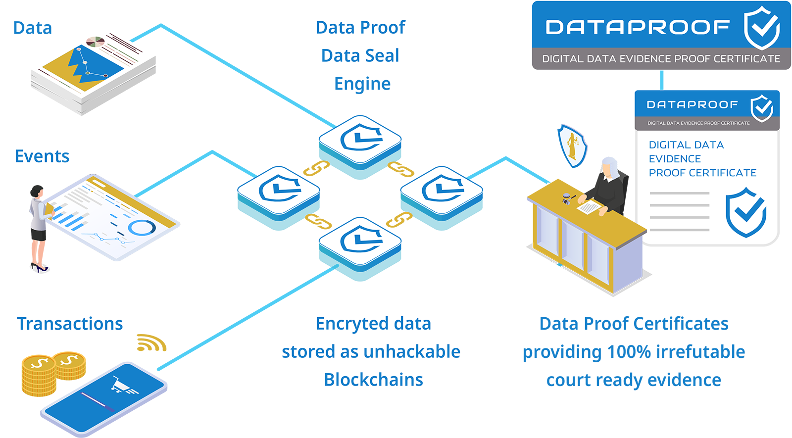 Once connected to Data Proof, your data cannot be hacked, altered or tampered with in any way, giving you immutable court ready proof of all data, transactions, workflows and 100% auditing regulatory compliance.